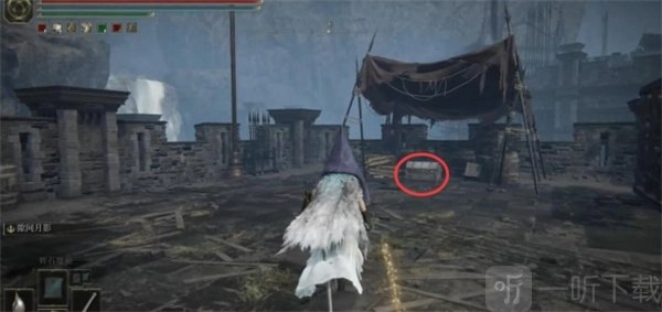 3、纵身跳下,来到恩希斯城关卡的城门楼上,在一处帐篷下方,能够发现宝箱,打开宝箱,就能获取武器“卡利亚魔法剑”。