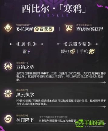 西比尔的基础属性是雷属性,她的被动技能“万军之势”有这样的效果:当该技能造成的伤害触发额外效果时,必然会获得固定数量的万钧之势效果。万钧之势的存量存在一定上限,它能让西比尔在释放夺神权柄和指尖风暴这两个技能时,消耗相应数量的能源,以此来制造爆发伤害。