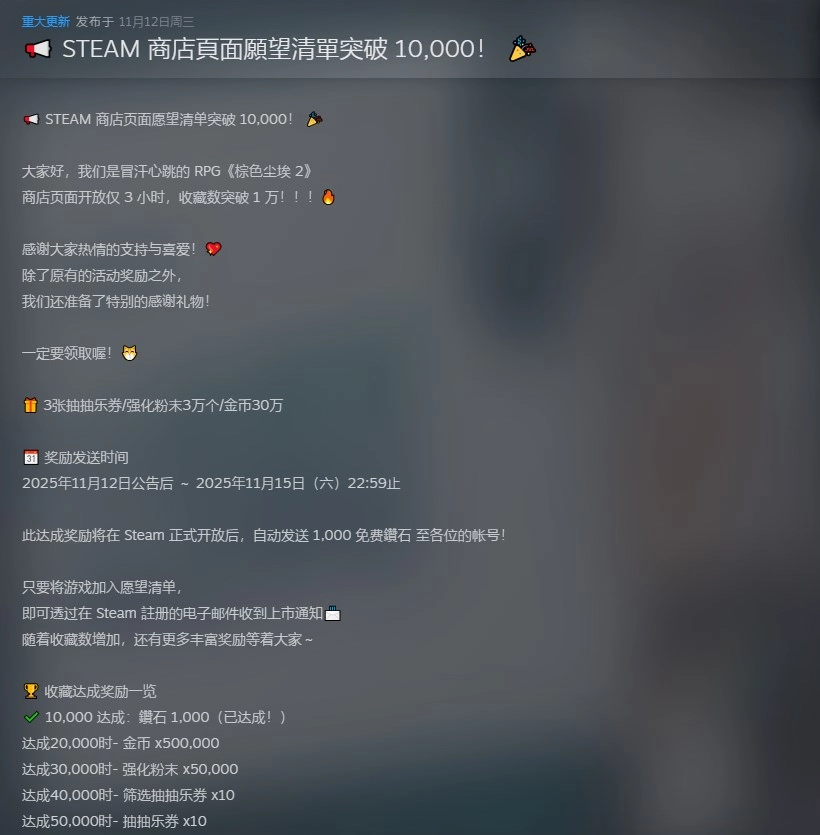 为庆祝《棕色尘埃2》Steam版即将上线,官方同步开启了愿望单添加活动与社交媒体转发活动,参与的玩家有机会赢取各类奖励。该游戏Steam版支持简繁体中文,且不会锁国区。
