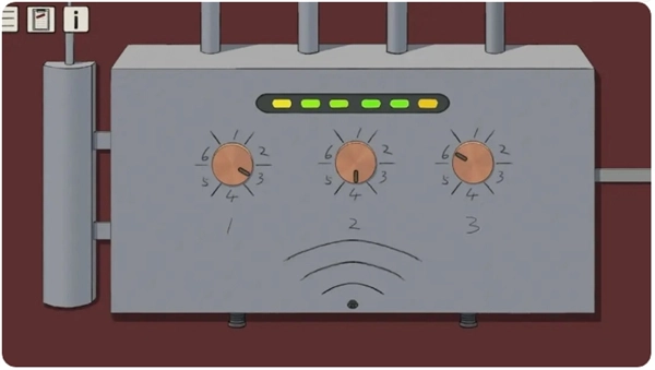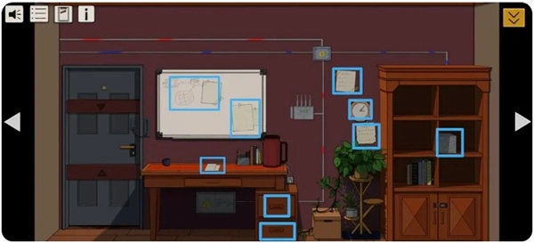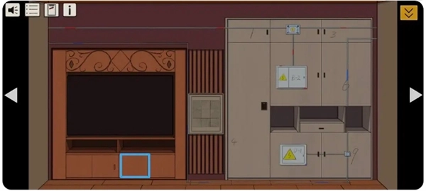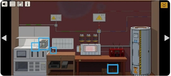 请点击位于中间位置的电箱设备,然后依照从左到右的顺序,依次把“电器元件A”、“电器元件B”、“限制器A”以及“限制器B”放置到四个凹槽里面。