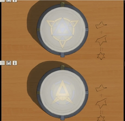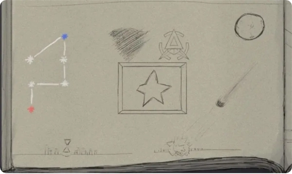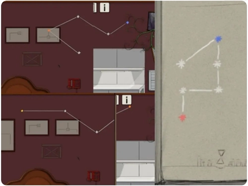 把“星空球灯”放置到窗户下方的摆件里面。依据窗户上的图案线索以及书中的图案线索,将星空灯调整成以下图案,如此便能获取星星连线线索。