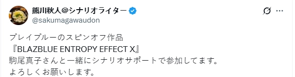 我十分荣幸能和驹尾真子一起以协作的身份,参与到衍生作品《苍翼默示录:混沌效应X》的剧本支持工作当中。感谢各位的支持与关注。另外要告诉大家一个好消息——《苍翼默示录:混沌效应X》的发售日期已经正式公布啦! ——熊川秋人