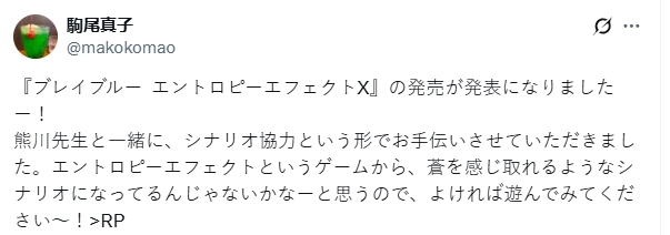 “我非常荣幸能以协作伙伴的身份,与熊川先生一同参与剧本创作工作。个人认为,这部剧本能够让大家感受到类似《混沌效应X》里苍翼默示录的独特氛围,倘若有机会的话,还请一定要体验一下!”——驹尾真子