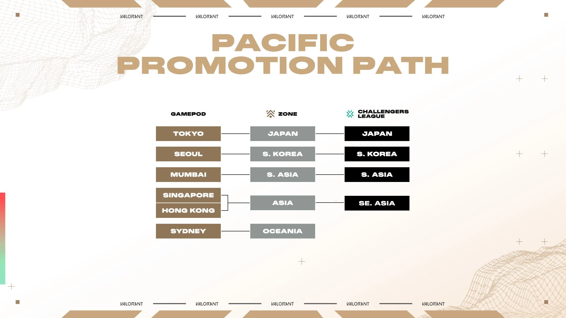 正如十月初所公布的,太平洋冠军之路将成为挑战者赛和二级战队角逐太平洋第二阶段季后赛资格,并借此一路晋级全球冠军赛的全新途径。尽管太平洋赛区会为挑战者战队保留四个参赛席位,不过大洋洲并未得到固定名额;相应地,大洋洲的顶尖战队将和南亚的头名战队以及东南亚的二号、三号种子一同参与最终资格赛。