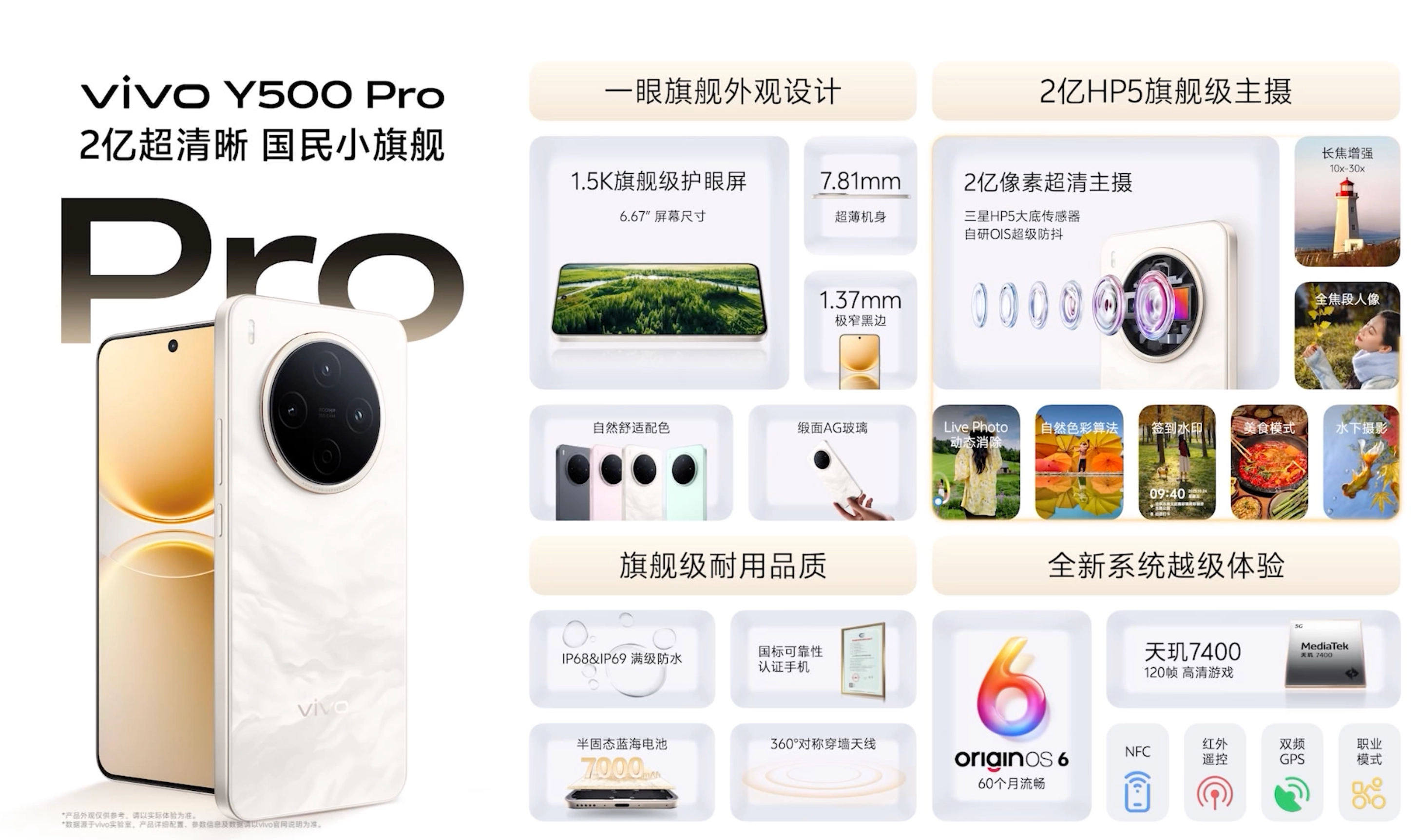 作为新机最大亮点,vivo Y500 Pro 在「同价位档」首发 2 亿像素三星 HP5 旗舰级主摄。