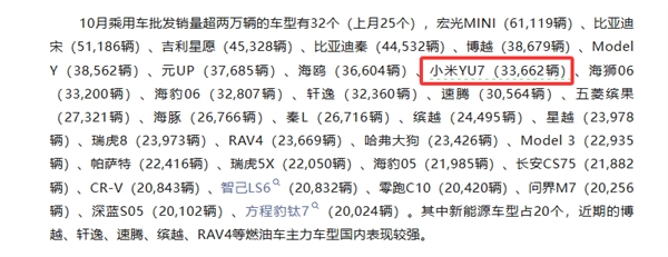 乘联会最新发布的数据表明,小米汽车10月份批发销量为48654辆(零售销量与之相同),而YU7车型的批发销量尤其亮眼,达到33662辆,成功跻身销量榜单前十!