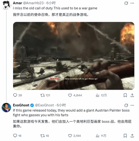 其他网友纷纷就此吐槽:《使命召唤》怎么会变成如今这副模样!瞧瞧以前《使命召唤5》的战役,那才称得上是真正的战争: