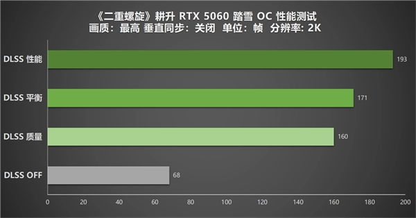 2K分辨率下,耕升 GeForce RTX 5060 踏雪 OC的原生帧数在关闭 DLSS 4 时能维持在68帧,能达到流畅游玩水平。开启DLSS 4后,性能提升更为显著,质量模式的帧率跃升至了160帧,实现了流畅体验;平衡模式的171帧为原生帧数的2.4倍,游戏体验更为丝滑;性能模式的帧率则高达193帧,较质量模式提升约20%,能提供接近电竞级别的帧率表现。