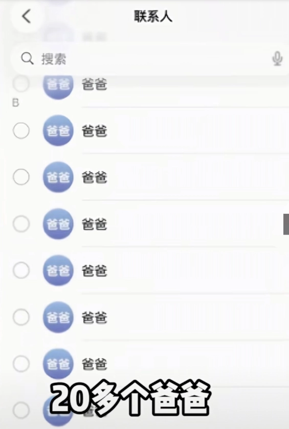 更让人匪夷所思的是,这些陌生联系人里竟然有20多个备注为“爸爸”、30多个备注成“老公”的。