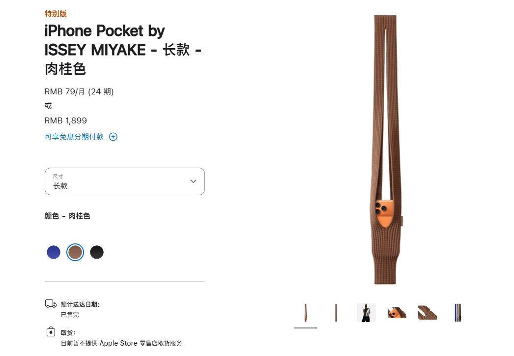 说白了,这其实就是个针织材质的手机袋,可它的用法却相当丰富。既能像挎包那样直接挎在身上,也能系在别的包上,还可以直接拿在手里。不过它的价格确实有点让人咋舌,短款有8种颜色可选,售价1299元;长款有3种颜色,售价1899元。我特意去苹果官网看了看,发现售价1899元的长款iPhone Pocket已经显示售罄了,而售价1299元的短款则需要等待一周才能发货!