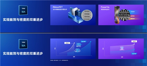 新技术的典型代表为Intel 18A工艺,它在全球范围内首次集成了RibbonFET全环绕栅极晶体管与PowerVia背面供电这两项埃米时代的核心技术,能够实现超过15%的性能增强、25%以上的功耗削减以及30%以上的晶体管密度提升,并且将作为Intel未来三年PC及数据中心产品的重要基础。