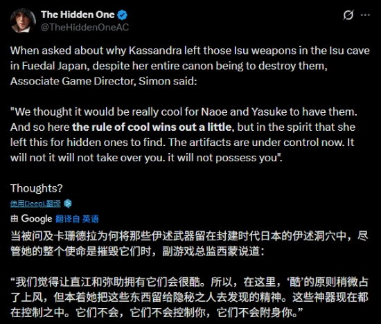 《刺客信条:影》的副总监西蒙针对卡珊德拉违背摧毁伊甸圣器这一核心设定、反而在封建日本的洞穴中留下那些神器的疑问作出了回应:“我们觉得让奈绪江与弥助得到这些武器会特别酷。在这一点上‘酷’的考量确实更占优势,而且这些圣器如今处于可控状态,不会对使用者的心智造成侵蚀。”