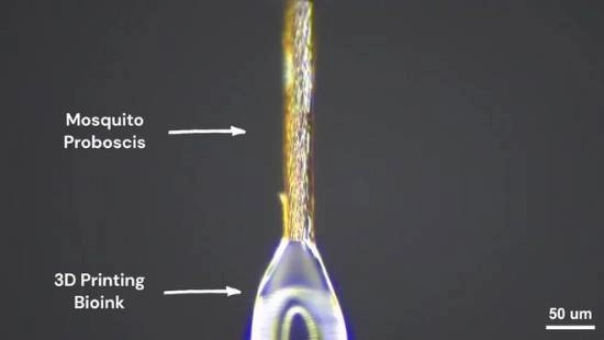 最终,历经数千年演化、结构精巧复杂的雌性蚊子口器,凭借其独一无二的性能崭露头角,被证明是处理高粘度生物墨水的绝佳之选。