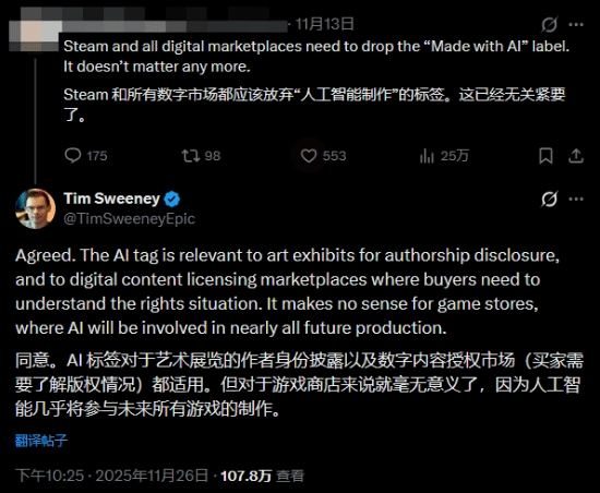 Tim Sweeney称:“AI标签在艺术展览品领域,作用是进行作者署名的披露;在数字内容授权市场中,目的是让购买者知晓版权情况。而在游戏平台商店里它完全没有意义,毕竟AI会参与未来几乎所有的制作工作。”