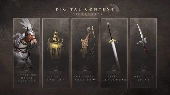 终极组合包内含以下物品:3种武器——狂魂弓箭、德里克西斯之枪、西埃洛斯双手剑,以及苏拉伍德提灯、伯利安马具套装。