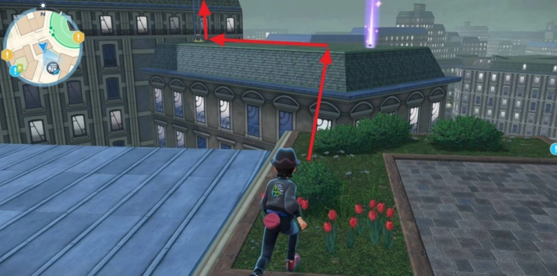 接下来留意右侧屋顶,借助滑翔功能跳到对面的屋檐边缘,再顺着路线爬梯子向左行进。
