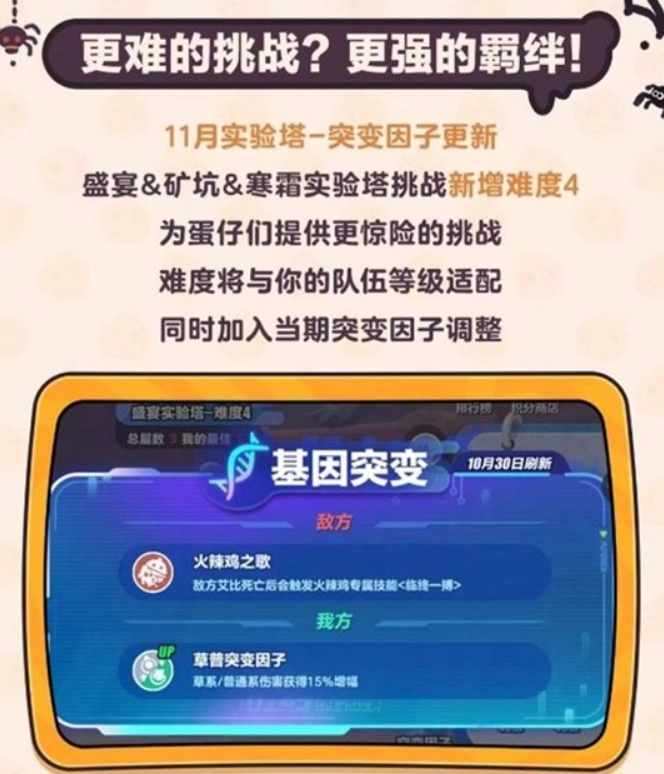本周五,《蛋仔派对》会对实验塔挑战的难度进行提升,新添难度4,给蛋仔们带来更刺激的挑战。此次更新除了提高挑战难度外,还会和你的蛋仔队伍等级相匹配,保证每个蛋仔都能在挑战里收获乐趣与挑战感。另外,游戏也会加入当期突变因子的调整,让挑战更具变化和趣味性。