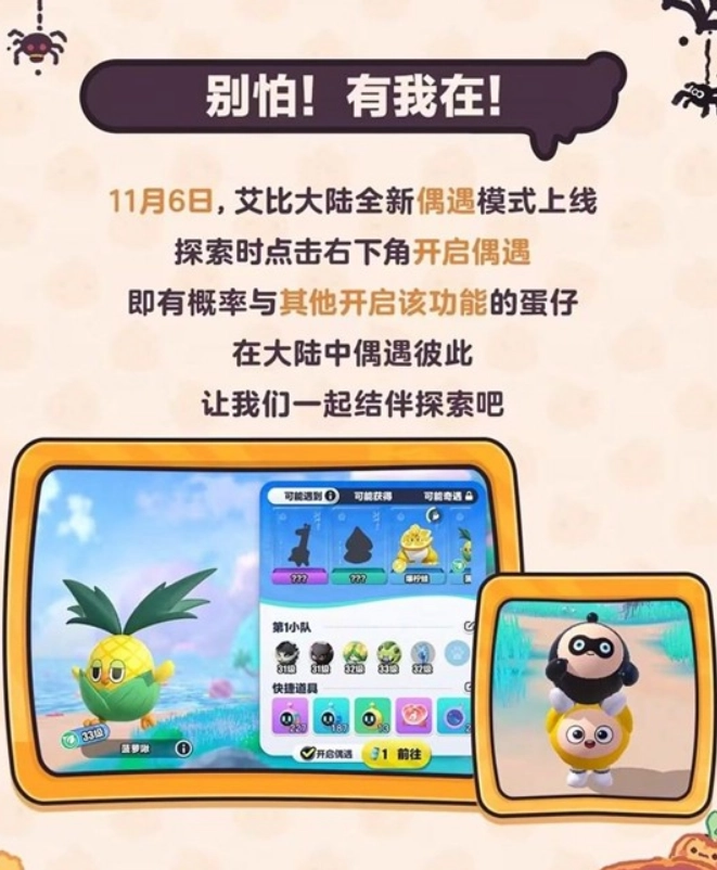 11月6日,艾比大陆将推出全新的偶遇玩法。在探索过程中,点击右下角开启偶遇功能,就有机会和其他同样开启该功能的蛋仔在大陆里不期而遇。这不仅仅是一场偶然的相遇,更是一次携手探索的契机。让我们一同结伴开启探索之旅吧!