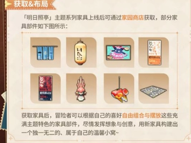 冒险者能够从家园商店里得到「明日照亭」主题系列的家具。得到这些家具后,冒险者可以按照自己的喜好来自由搭配和摆放这些带有主题特色的家具部件,充分施展自己的想象与创意。
