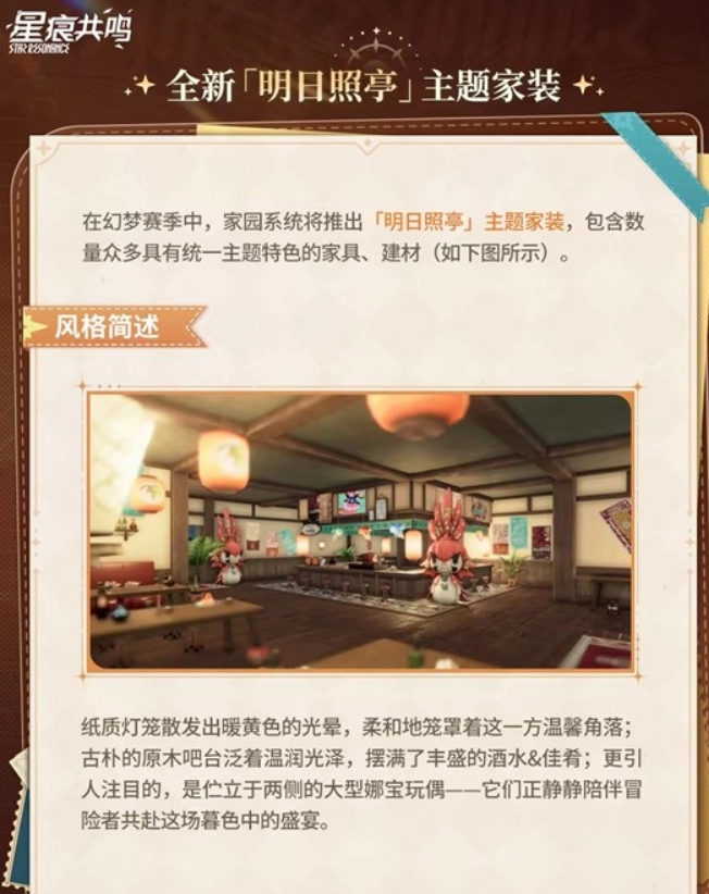 随着《星痕共鸣》S2赛季的脚步越来越近,官方正式公布将推出全新家装主题“明日照亭”。该主题将于明日(10月30日)更新后与玩家见面!下面是小编整理的详细介绍,感兴趣的玩家不妨来了解一下~