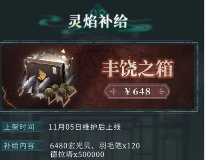 补给内容:6480宏光贝、120支羽毛笔、500000德拉塔