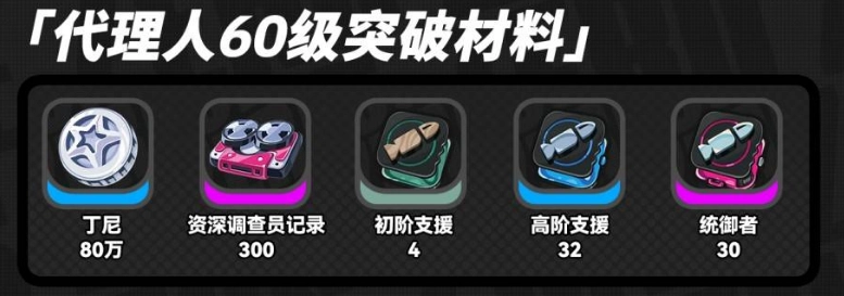 代理人1至50级突破所需材料如下:丁尼40万、资深调查员记录150份、初阶支援4个、高阶支援32个、统御者10个。