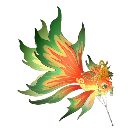 灯与月遥遥相望,正是人间美好的时光。鱼形的灯笼随着水波轻轻晃动,模糊的星光映照在小小的池塘里,微风吹过,水面泛起一圈圈涟漪,鱼儿仿佛在月光中嬉戏游动,仿佛在邀请船舫的主人走进一场尘世中的繁华梦境。