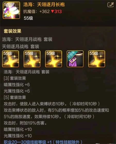 ⑫天翎逐月套装——新增“光/暗属性强化+6;攻击时附加6%伤害;攻击时使敌人进入束缚状态10秒”。