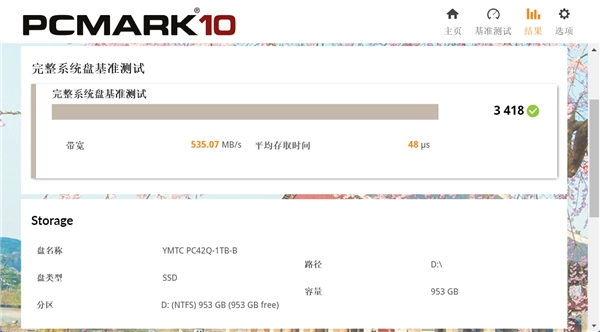 我们围绕实际使用、游戏加载和发热管控等维度开展应用模拟测试。在PCMARK10完整系统盘基准测试环节,我们将固态硬盘模拟为系统盘,并结合办公、视频播放等实际应用场景,对其I/O性能进行评估。测试结果显示,长江存储PC42Q 1TB的得分为3418分,带宽达535.07MB/s,平均存储时间为48μs。
