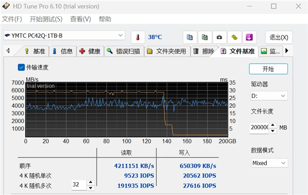 在HD Tune Pro中向长江存储PC42Q 1TB写入200GB数据,通过速度曲线可看出写入速度基本维持在6500MB/s,在136GB左右开始出现SLC缓存用尽迹象。
