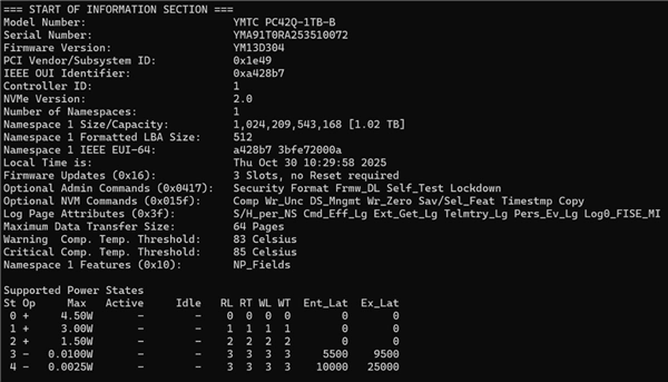 相较于零售版固态硬盘,OEM产品对功耗表现更为关注。通过smartmontools工具可发现,长江存储PC42Q内置了5种预设电源模式:全速运行的PS0模式最高功耗仅4.5W,这一数值比不少PCIe4.0 DRAMLess固态硬盘低了三分之一乃至一半;浅度睡眠的PS3模式功耗可降至1mW,深度睡眠的PS4模式更是低至0.25mW的惊人水平!这再次体现了其行业领先的技术实力,意味着笔记本无论是在脱离电源使用时,还是在合盖待机状态下,都能有效延长电池的续航时间。