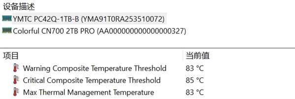 固态硬盘低功耗的另一个优势,就是能避免主控芯片高温造而掉速,还能降低笔记本整机的散热压力。在AIDA64中我们可以可知长江存储PC42Q的温度墙为85℃,警告温度为83℃。
