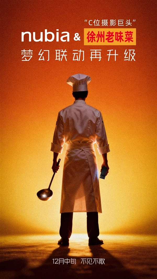 这还不够,努比亚官方今日宣布,努比亚与徐州老味菜的梦幻联动将再度升级,具体细节将于下周揭晓。从预热海报中可以看到,一位厨师一手持勺、一手握相机,让人不禁好奇努比亚这次又会带来怎样的惊喜。