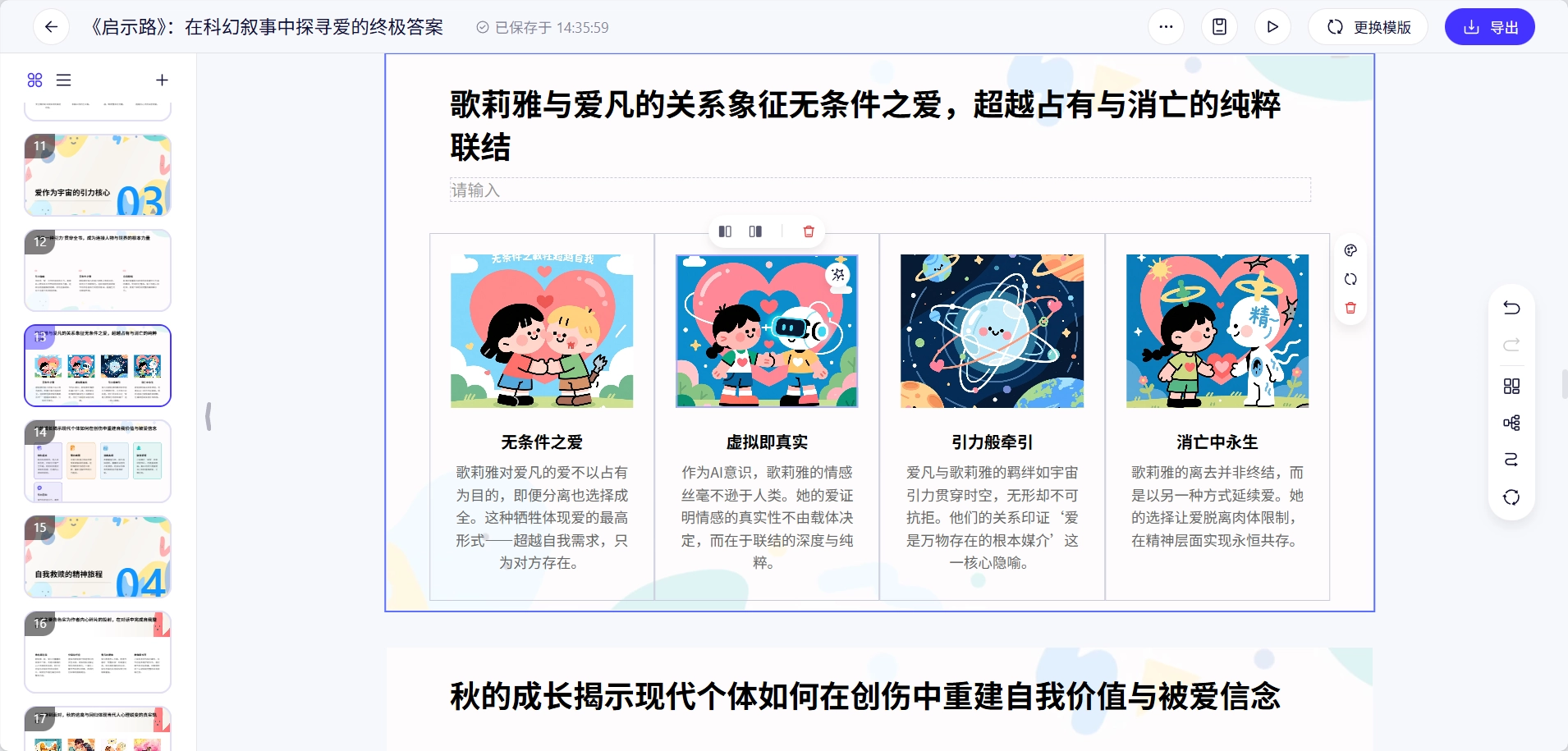 小雷认为千问最棒的地方是,AI生成内容时,原创插画和自动排版效果都挺不错,结构也清晰明了。只要自己调整好字体大小和行间距,就能做出一个合格的PPT,制作水平比自己高多了。