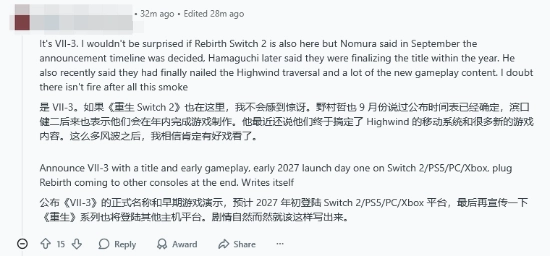 hashtagtylerh推测,其中一个或许是《最终幻想7》重制系列的第三部作品,另一个则有可能是《最终幻想9》的重制版。评论区里其他网友也发表了相近的观点,不过也有部分玩家提及了《最终幻想14》《最终幻想17》等游戏。