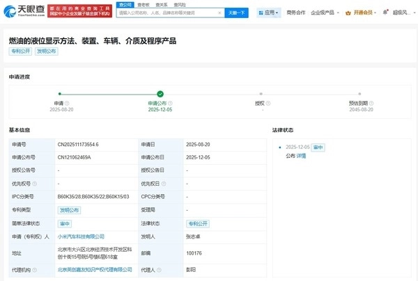 近日,天眼查APP公开信息显示,小米汽车科技有限公司的一项名为“燃油的液位显示方法、装置、车辆、介质及程序产品”的专利已正式公布。
