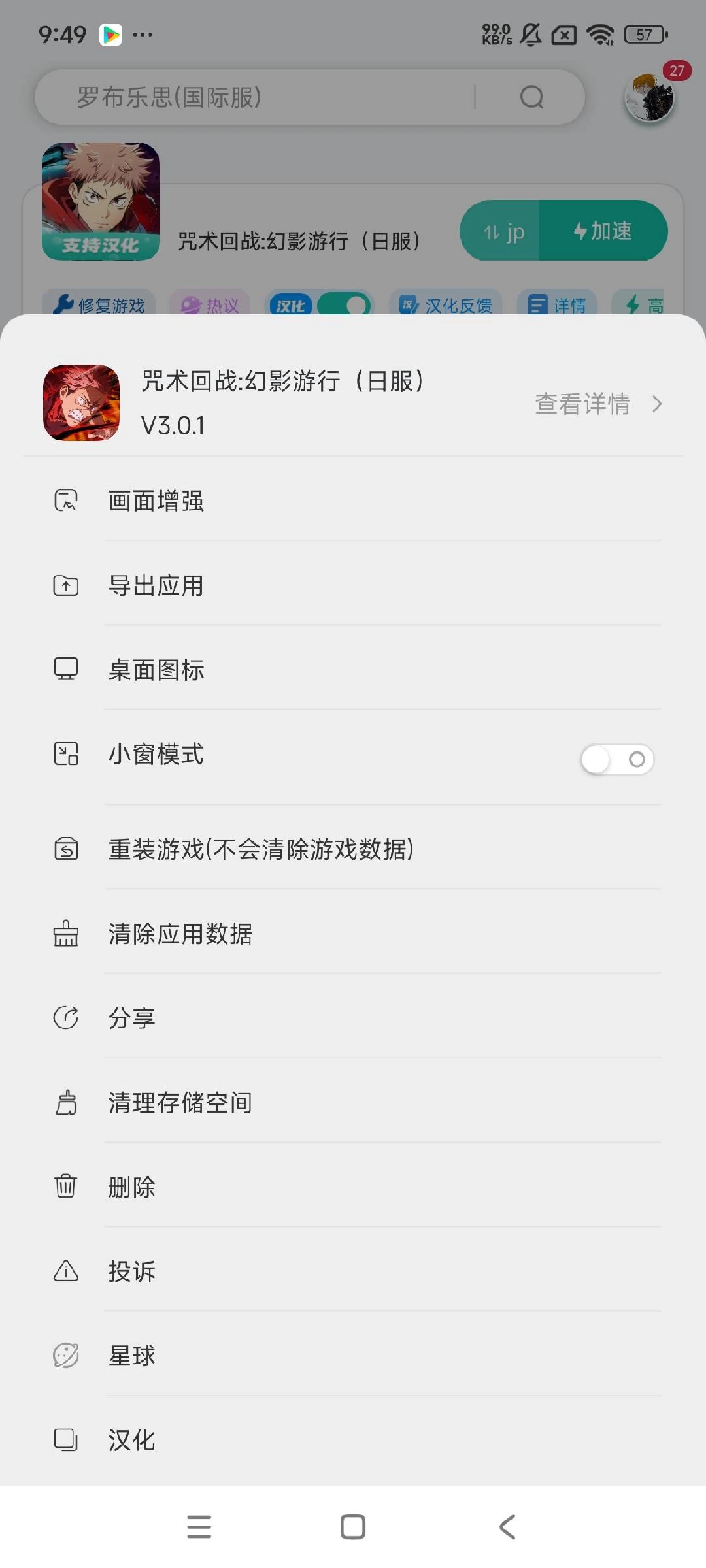 下载完成后,你会看到咒术回战:幻影游行日服的图标带有“支持汉化”的标识。此时,长按“导入应用”旁边那个标有“咒术回战:幻影游行日服”的小图标按钮,系统就会弹出游戏的辅助设置弹窗。在这个弹窗的底部位置,你能找到“汉化”按钮,点击它即可。