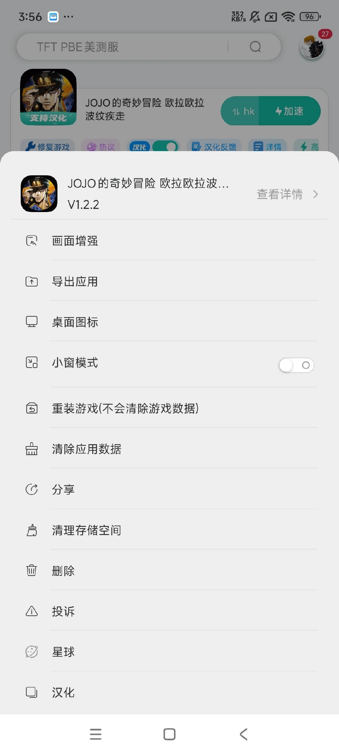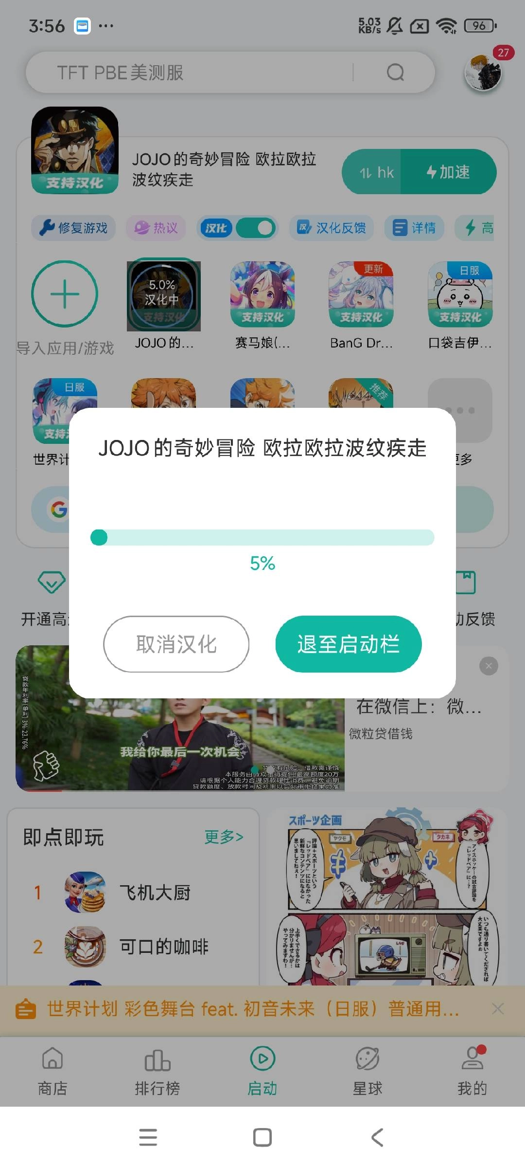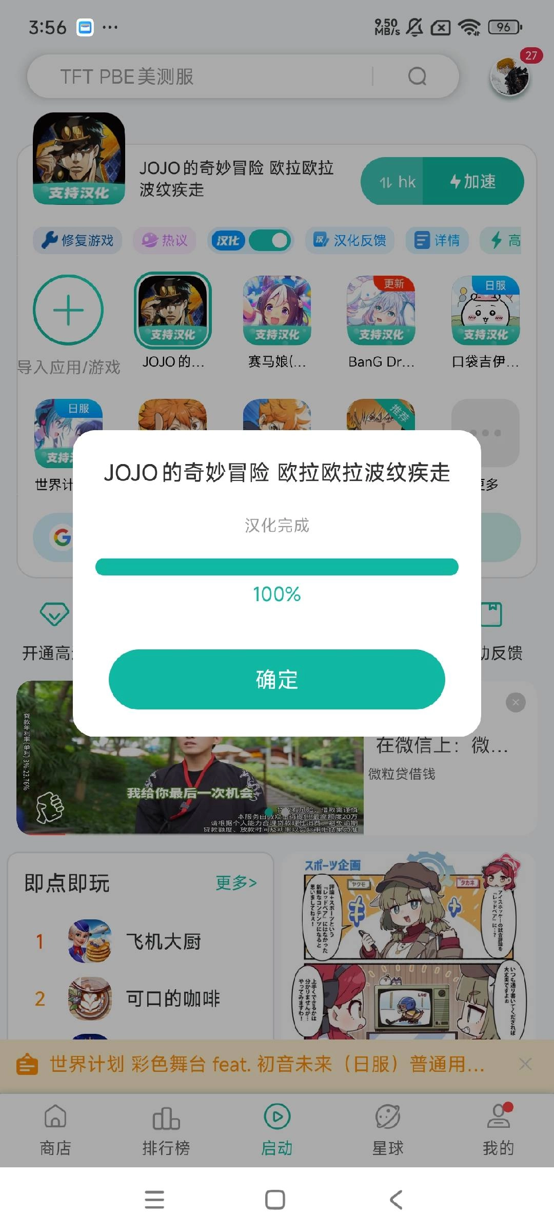 下载完成后,JoJo奇妙冒险的图标上会显示“支持汉化”的标识。此时,你需要长按“导入应用”旁边的“JoJo奇妙冒险”小图标按钮,这样就会弹出游戏相关的辅助设置弹框。在这个弹框的底部,你可以找到“汉化”按钮,点击它即可。