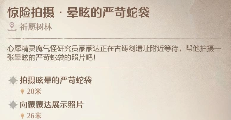 任务需求:心愿精灵魔气怪研究员蒙蒙达此刻正在古铸剑遗址周边等候,帮忙为他拍摄一张处于晕眩状态的严苛蛇袋的照片。
