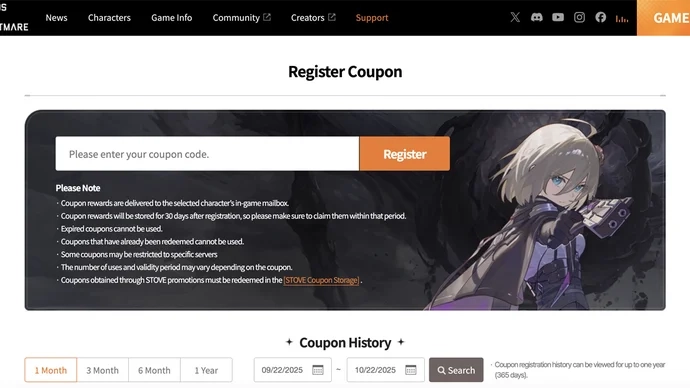 访问 Chaos Zero Nightmare 官方优惠券兑换网站。