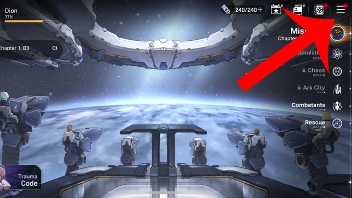 Chaos Zero Nightmare 大厅中指向游戏主菜单按钮的箭头。