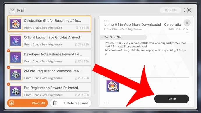 指向玩家必须按下才能从 Chaos Zero Nightmare 邮箱领取奖励的按钮的箭头。