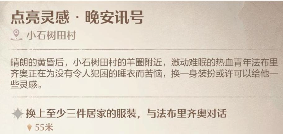点亮灵感,“晚安讯号”任务需在小石树田村完成。在晴朗的黄昏过后,于小石树田村的羊圈周边,那位激动得难以入眠的热血青年法布里齐奥,正为没有能让人犯困的睡衣而发愁。或许换一身装扮能给他带来一些灵感。那么,法布里齐奥究竟在何处呢?接下来为大家分享《无限暖暖》“晚安讯号”任务NPC法布里齐奥的位置!
