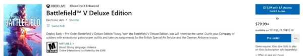 EA旗下的射击游戏大作《战地5》现已在微软商店上架。根据商店页面的信息显示,该作标准版售价为59.99美元,约合人民币416元,安装需要31.89GB的硬盘空间;豪华版售价79.99美元,约合人民币554元,所需硬盘空间为31.9GB。