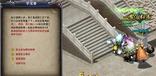 天下大势向来是分合交替,分久必合,合久必分。如今正值动荡不安的时期,洛阳这座军事重镇究竟该由谁来镇守呢?答案自然是在帮派联赛中脱颖而出、跻身前三的帮派!想要参加帮派联赛的话,找到NPC宇文肃就能完成报名,报名时间是每周一中午12点到周二晚上8点。联赛总共分为三轮,比赛时间分别定在周二晚上9点01分、周四晚上9点01分和周六晚上9点01分。最终决出的联赛前三名帮派,将获得参与周日晚上9点“皇城争夺战”的资格。这一次洛阳的归属究竟会落在哪一方手中,让我们一同拭目以待!