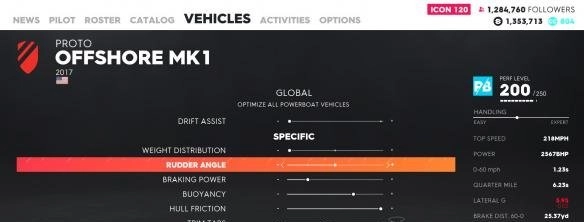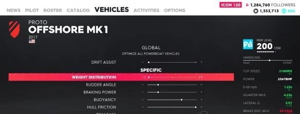 不过这种设置并非适用于所有船只,我在游戏里有3艘动力艇,另外两艘就不是把所有参数都往左调效果最佳,但调整起来也很简单,只要左右微调找到极速最高的那个档位就行。但喷射冲刺艇这类船(就是那些搭载V8引擎的小船)情况就不太一样了,虽然大体上也是往后调整,同样是找极速最高的档位,但有几条赛道的小河道弯道特别急,把重量分配调在最佳档位往左1-2格,转向性能会更好一些。