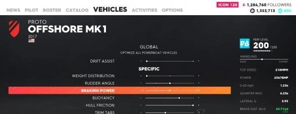 制动力的调节方向是往右调会增加,往左调则降低。不过这对船来说没什么实际作用,因为驾驶船只时始终得按住油门,而且目前所有的船类赛事,包括JetSprint在内,都没有哪一项需要依靠制动来实现减速,所以这一项完全可以不用去管。