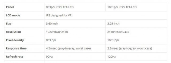 新的面板尺寸会更小,同时具备更高的分辨率、更高的刷新率(120hz对比90hz),以及更低的延迟(响应时间)。下面为大家呈现803ppi面板与1001ppi面板的技术规格对比: