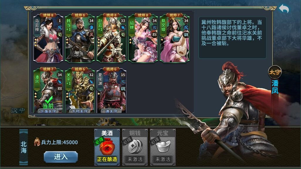 首先,若不考虑让甘宁参与战斗,玩家们不妨优先将他安排到城市管理的岗位上。建议派他去北海这类地方任职,甘宁在当地能助力玩家提升美酒、铜钱和元宝的产出,从而为后续的战斗储备充足资源。