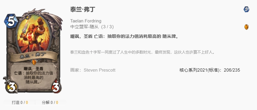 在起手留牌的策略上,这套卡组的核心思路是起手全部换掉,全力寻找博学者或者时泰兰佛丁这两张关键卡牌。